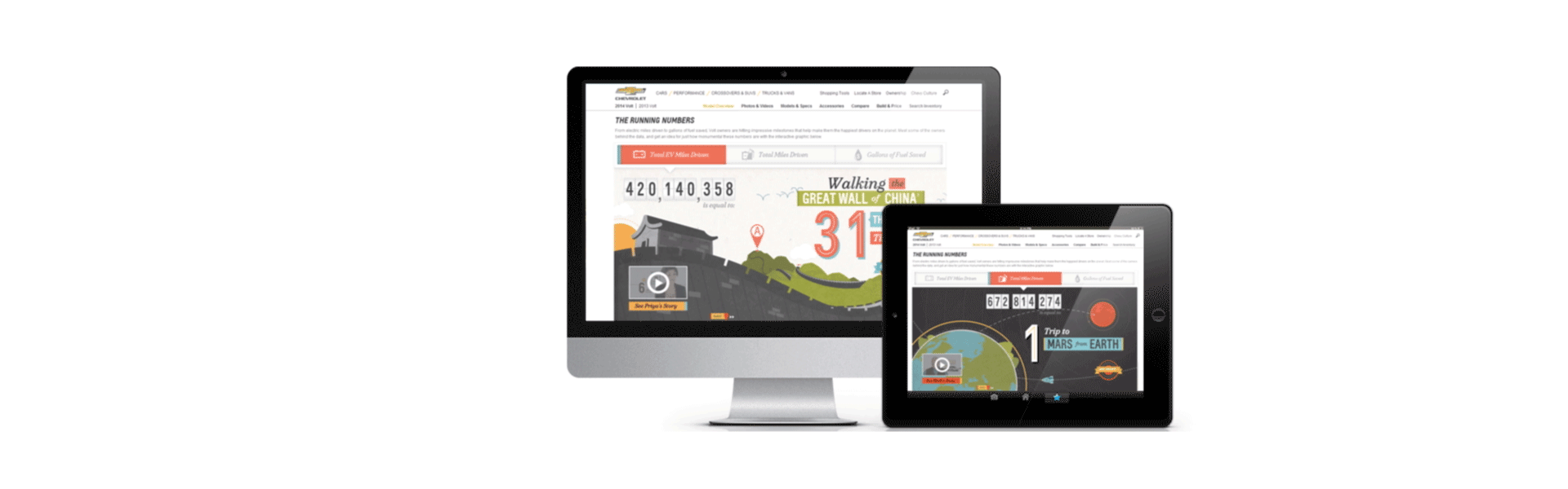 ...And peel out with Chevy's sporty gas-saver on your way to work, downtown, or a stealthy weekend to Vegas. Way back when, I designed and animated on 'Mark' and 'Priya' for the Volt launch campaign. I also did some work on the interactive portion of the project, designing landscapes and layouts and sneaking in a little cel animation.